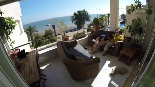 El sexo sexual en el balcón de la playa mientras la gente camina cerca