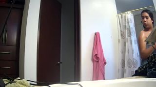 chica delgada lindo desvestirse y cambiar tampón en el baño. ocultado...