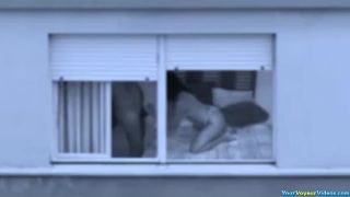 Pareja madura follando por la ventana atada por mieur al otro lado de la calle. Ella le chupa la polla y se deja follar por detrás.