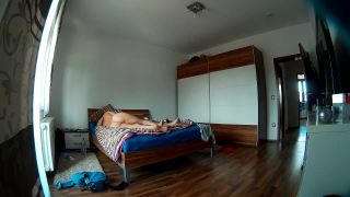 caught voyeur brunette milf watching porn and masturbating with toys on the bed