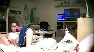 Horny girl masturbating with dildo and toy on the bed. hidden cam