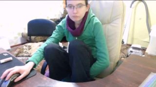 Horny glasses girl fingering pussy at computer