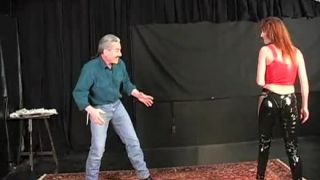 Maria may be tough, but she's not tough enough to stop Lew from taking her down like a rodeo'd calf. It's a real fight, but it's over once the ropes go on. Maria, bound hand and foot, is helpless before Lew. Lew slaps her around, spanking and squeezing. He shoves a big black dildo in her mouth, making her suck and groan. Finally, he makes the gasping gal come hard with a big vibe shoved between her legs.