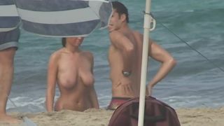 This is some kind of a mixed, nudist friendly beach, with bikinis optional. That being said, when this stunning girl arrived, all eyes were on her. First she got topless and revealed her tantalizing natural tits, and then she got fully naked to catch some suntan.