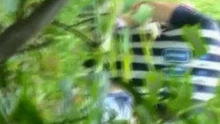 Voyeur hidden in the bushes catches teen couple fucking outdoors in the nature. She gets fucked missionary style before riding him.