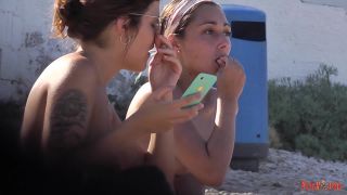 I found four topless 20 something babes sunbathing together at one of my favourite stone beaches. Part way through I changed position. This was in order to get a better view of the natural tanned boobs on display. My favourite is the one with the tattoo under her right breast when she rubs oil into them for us!