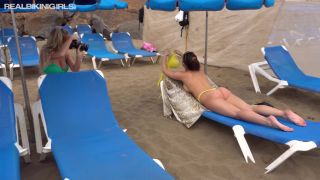 Amelia W is being spied on at the beach whilst she layers up the sun cream ready to get her tan on. Behind the scenes footage