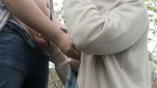 She gets on her knees and pulls her tits out of her shirt. She jerks him off while he fondles her tits. She give him a blowjob and he fucks her mouth. She shoves his cock down her throat. He cums on in her mouth and on her body.